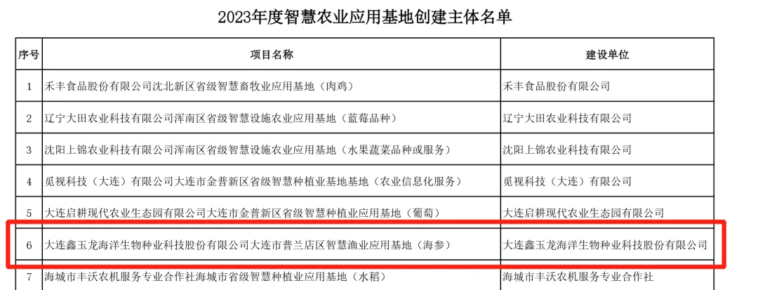 近日,2023年度省级智慧农业应用基地创建主体名单公示,名单共公示创建主体20个,其中大连鑫玉龙海洋生物种业科技股份有限公司荣誉上榜。鑫玉龙获评2023年度省级智慧农业应用基地。